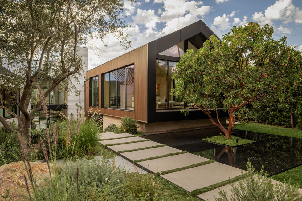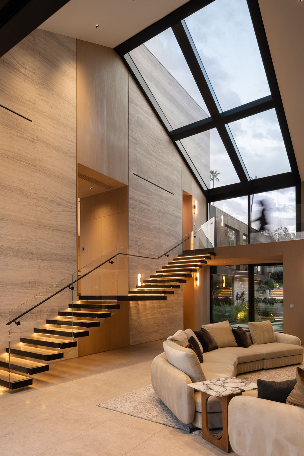 Santa Monica Mountain Residence updates a mid-century home with new skylight volumes, a continuous curtain wall, and a double-height living space carved from the former basement, opening views to the surrounding hills. A two story addition introduces an ADU and a wellness level with gym, sauna, and plunge pool. Terraced landscaping, olive trees, and linear paths integrate the home with its hillside site. Interiors use a restrained palette of stone, wood, and metal, with monolithic bathrooms and a skylit stair establishing a calm, cohesive atmosphere.